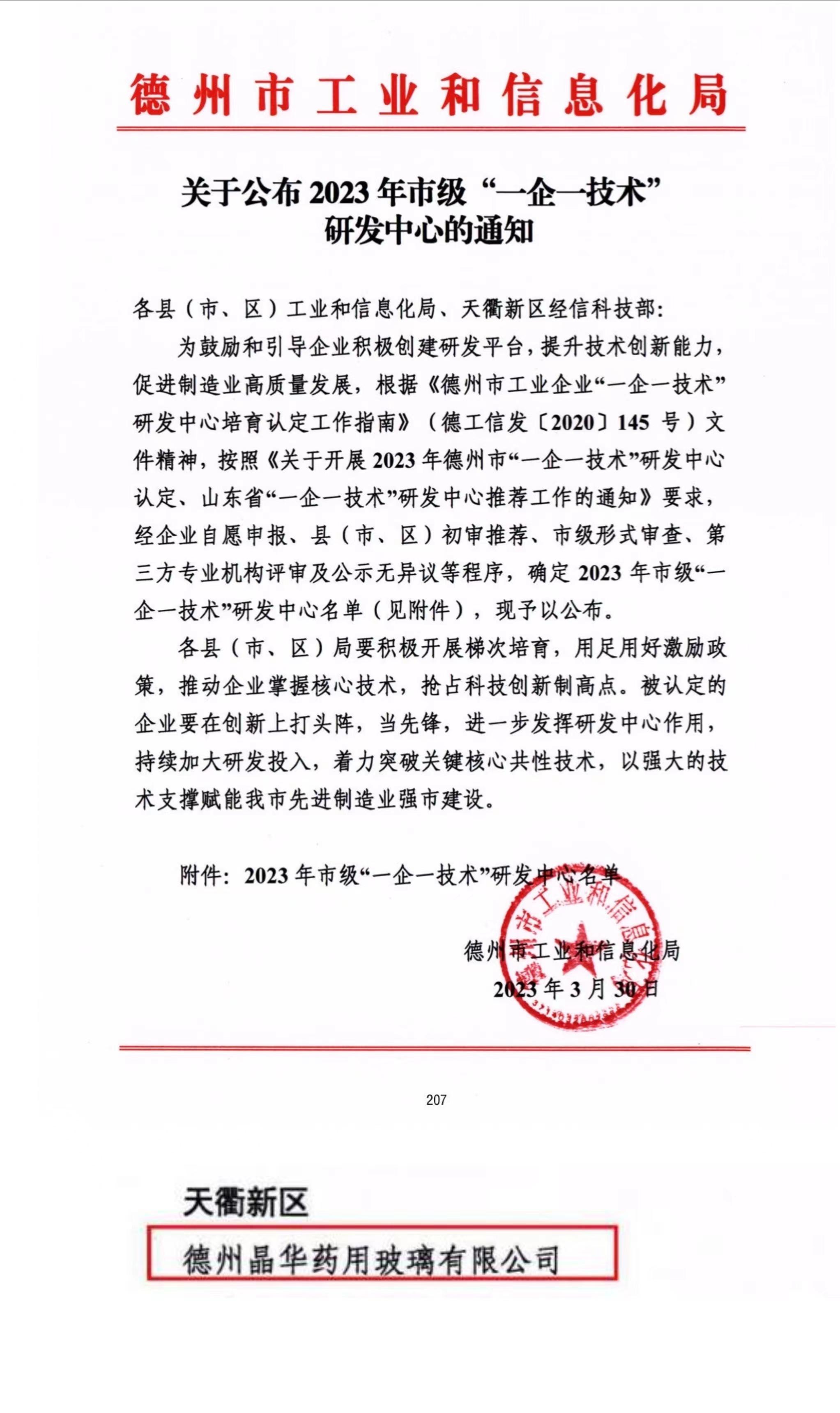 2023年3月30日,德州市工業(yè)和信息化局公布了《關(guān)于公布2023年市級“一企一技術(shù)”研發(fā)中心的通知》,德州晶華藥用玻璃有限公司獲得市級“一企一技術(shù)”研發(fā)中心認定。市級“一企一技術(shù)”研發(fā)中心是企業(yè)開(kāi)展技術(shù)研發(fā)、推進(jìn)技術(shù)成果轉化、創(chuàng )新人才培養的綜合性技術(shù)創(chuàng )新平臺,研發(fā)中心的建立可以充分發(fā)揮企業(yè)在技術(shù)創(chuàng )新中的主體作用,建立健全企業(yè)技術(shù)研發(fā)創(chuàng )新的新機制。